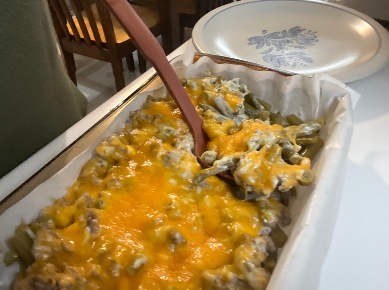Drain the liquid from the two cans of green beans then add them to a casserole dish or glass baking pan. Pour the ground beef mixture over them then top it off with the mozzarella and cheddar cheese.