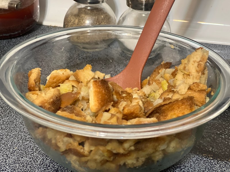Chop onion and celery then place in a medium mixing bowl. Add in the toasted cubes of keto bread and spices, salt and pepper. Melt butter in microwave for about 22 to 30 seconds then pour over mixture. Stir to combine then mix in chicken broth. Add in walnuts if you prefer.