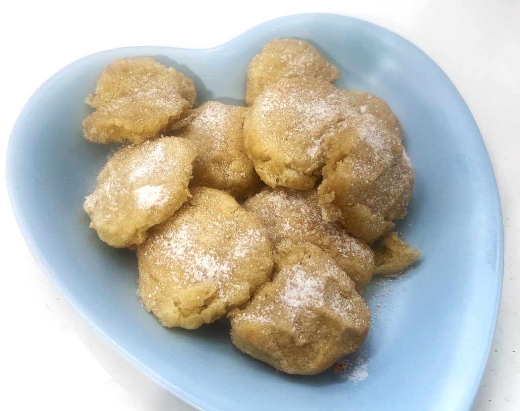 Use your hands to roll out tablespoons of the dough to form small balls, then roll them in the sweetener and cinnamon coating. Press slightly onto a cookie sheet lined with parchment paper.